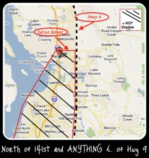 The ineligible area of Snohomish County Washington includes all of the area South of 140th Street NW, West to Interstate 5. South on Interstate 5 to the water in Possession Sound at Port Gardner. Following the coastline South to the King County Line, East long the King County line to State Route 9. North on State Route 9 to 140th Street NW.